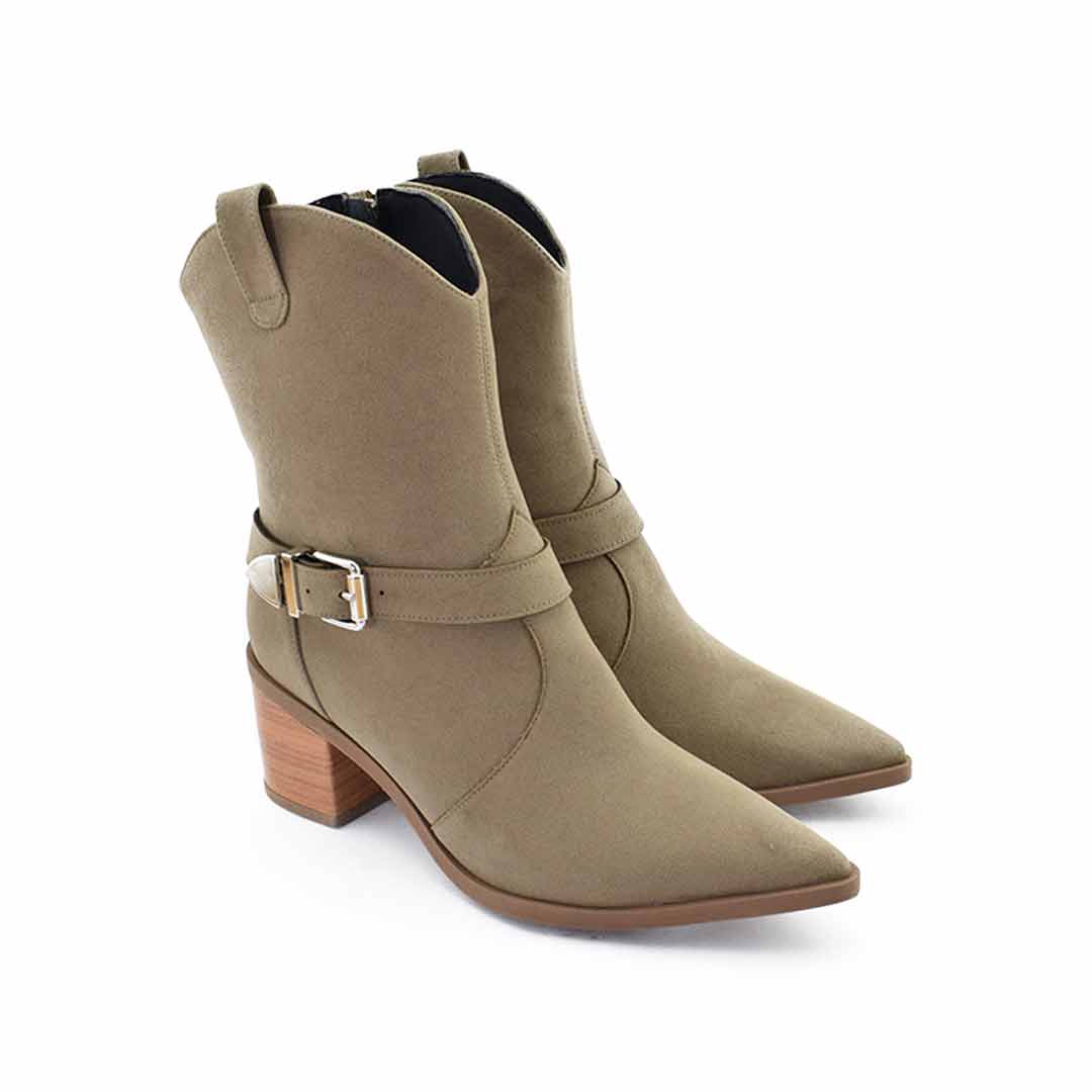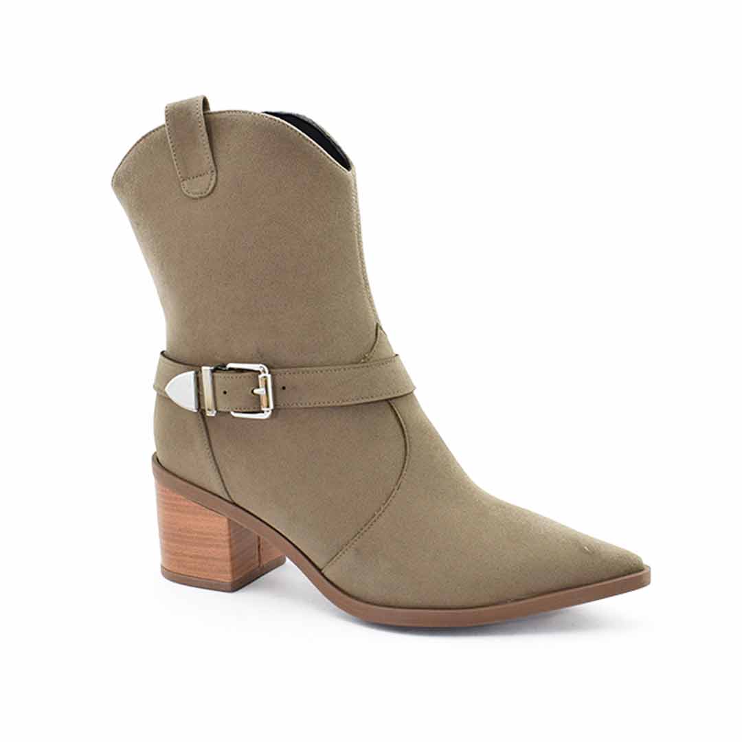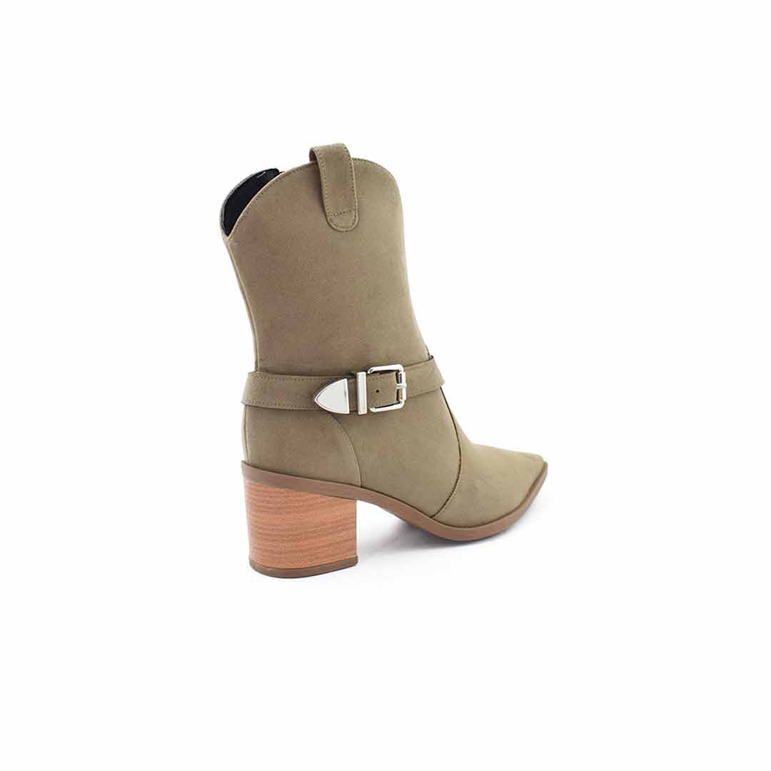 Botas texanas de mujer con un diseño estilizado y moderno, ideales para realzar tus looks de temporada. Están confeccionadas en material sintético con acabado gamuzado, cuentan con caña media, punta fina y un taco ancho forrado símil madera que brinda estabilidad y estilo.