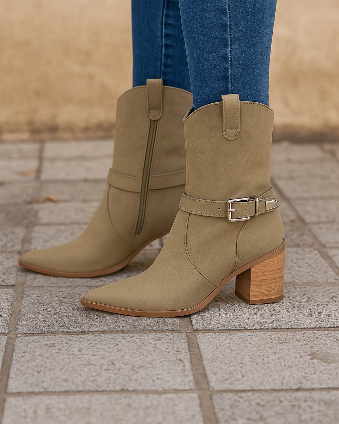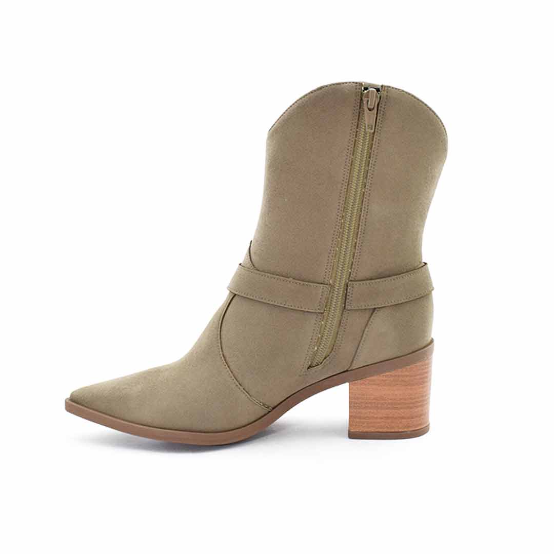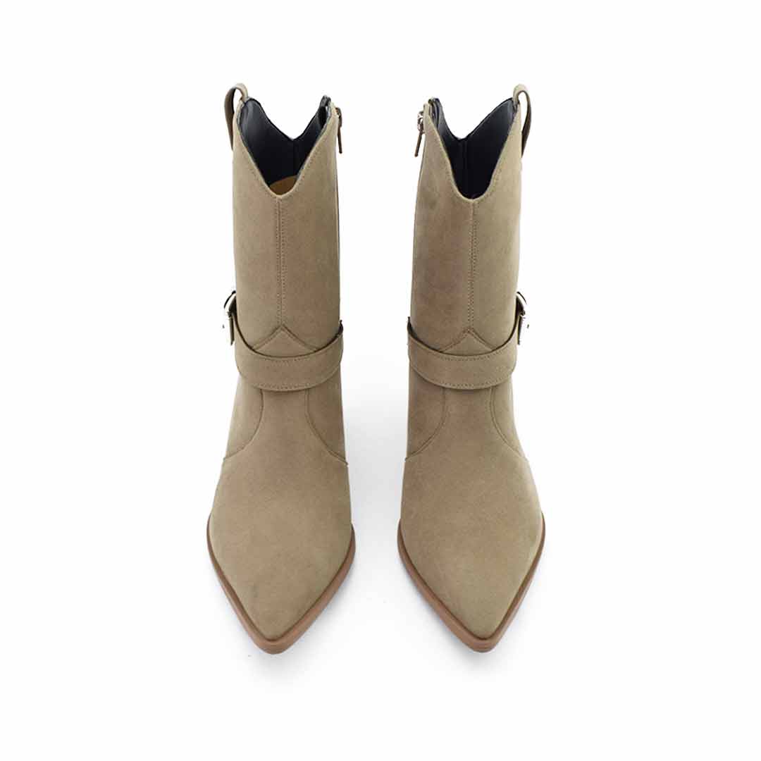 Botas texanas de mujer con un diseño estilizado y moderno, ideales para realzar tus looks de temporada. Están confeccionadas en material sintético con acabado gamuzado, cuentan con caña media, punta fina y un taco ancho forrado símil madera que brinda estabilidad y estilo.